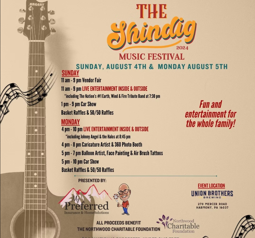 AUGUST 4, 2024 TO AUGUST 5, 2024 Shindig 2024 Music Festival The Shindig 2024 Music Festival will take place at Union Brothers Brewing, located at 270 Mercer Road in Harmony, PA, on Sunday, August 4 and Monday, August 5, 2024. This two-day festival, hosted by My Preferred Insurance & Home Solutions and supporting the Northwood